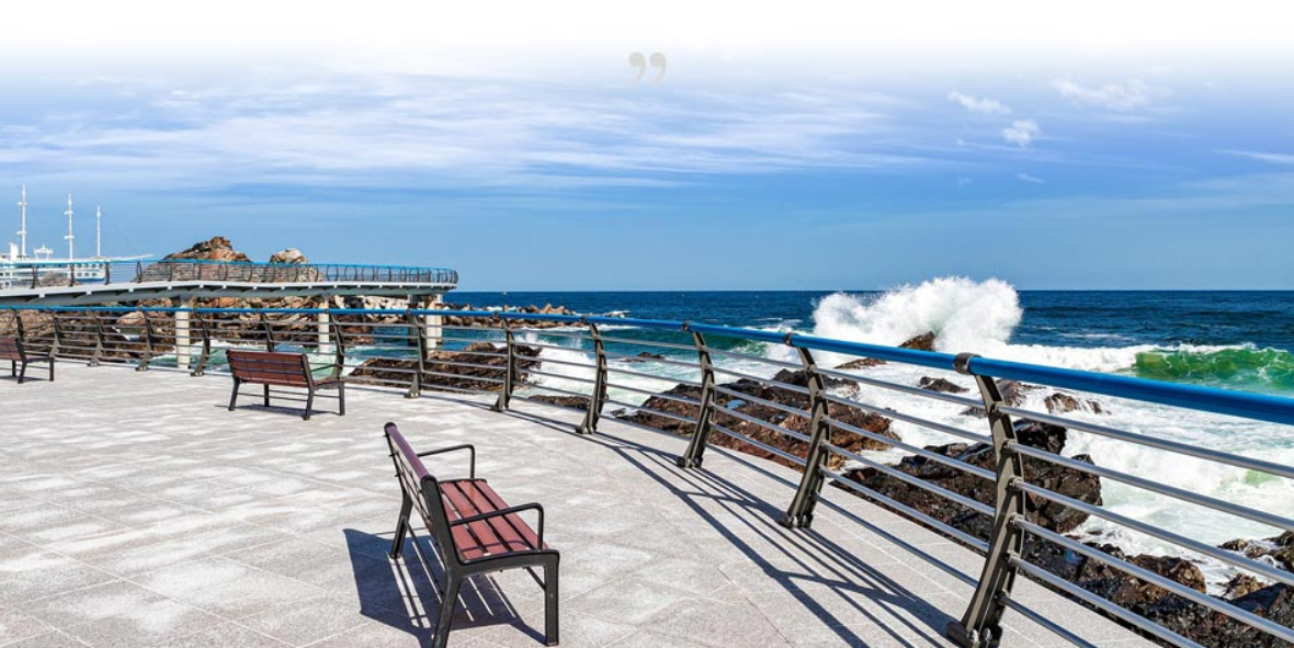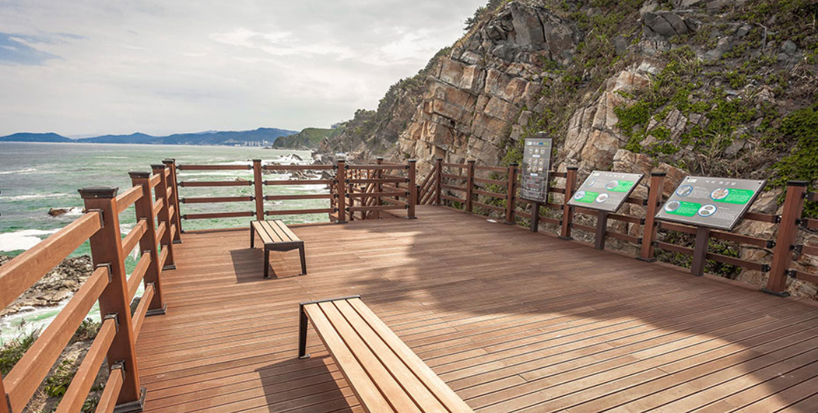 끝나갈 듯하면서도 한 번 더 이어지는 곡선형 데크 길에서는 발아래에 파도가 부딪히며 생긴 바위 지대를 자세히 살펴볼 수 있습니다. 이곳의 암석 구조가 독특해, 지질학적으로도 가치가 높다고 하는데요. 사진으로 보던 것과 달리 직접 보면 거대한 바위 층이 파도에 깎여 만들어진 풍화의 흔적이 무척 인상 깊습니다. 건너편에 심곡항이 아스라이 보이기도 하니, 바닷바람을 맞으며 잠시 쉬어 가기 좋은 지점이기도 합니다.
