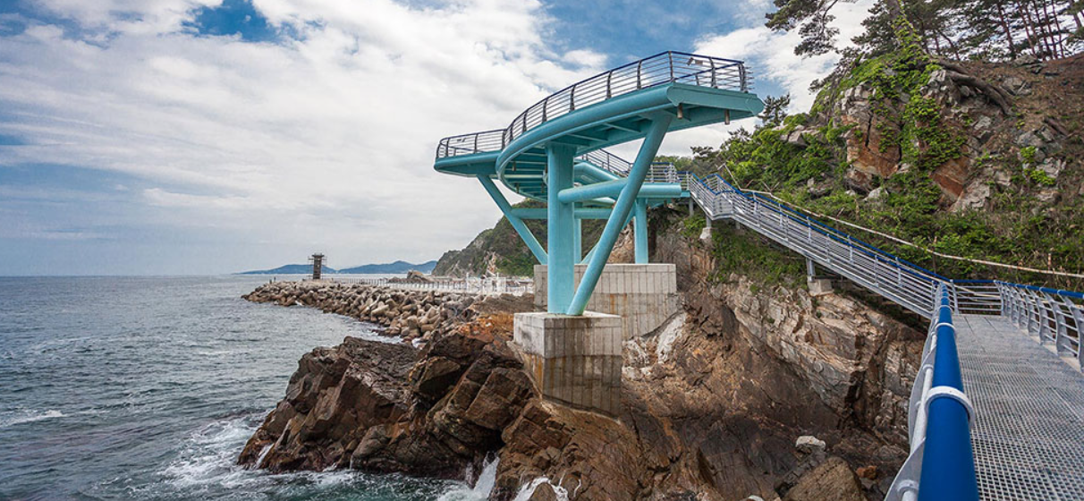 바다부채길을 조금 걸어가면, 해안 절벽을 따라 바다 쪽으로 살짝 돌출된 전망 데크가 여러 군데 나타납니다. 보통 철제 난간으로 잘 둘러져 있어 안전하니, 심한 고소공포증이 아니라면 과감하게 데크까지 나가 보세요. 물살이 세차게 부딪히는 아래쪽 바다를 내려다보면, 마치 바다 위에 떠 있는 듯한 스릴도 느낄 수 있고, 파란 동해의 수평선도 시원하게 한눈에 조망할 수 있습니다.