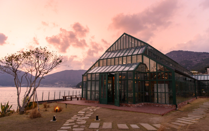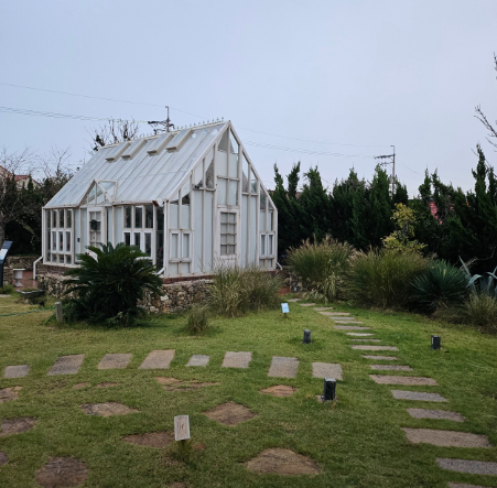 구조라 해수욕장 인근에 위치한 '외도 널서리'는 온실 속 다양한 식물과 함께 커피를 즐길 수 있는 카페입니다. 통유리를 통해 바다 풍경을 감상할 수 있으며, 구조라 에이드와 널서리 커피 등이 추천 메뉴입니다.
