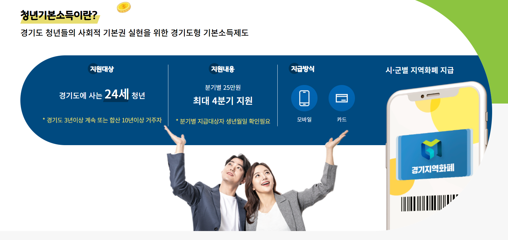 청년기본소득으로 지급되는 25만 원은 경기지역화폐 형태로 들어옵니다. 지역화폐는 모바일 앱 혹은 실물 카드 형태로 발급받을 수 있는데, 시·군마다 앱 종류가 다르거나 카드 디자인이 다를 수 있으므로 자신의 거주지에 맞춰 확인하면 됩니다.