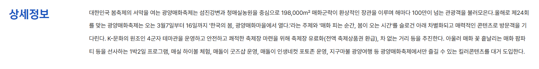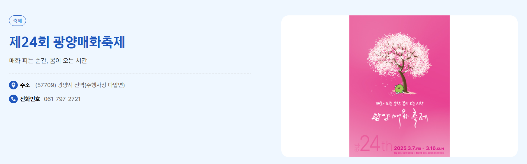 광양매화축제는 봄의 시작을 알리는 대표적인 행사로, 가족, 친구, 연인과 함께 아름다운 매화꽃과 다양한 프로그램을 즐기며 특별한 추억을 만들어보시기 바랍니다.