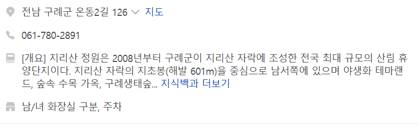 지리산 정원은 2008년부터 구례군이 지리산 자락에 조성한 전국 최대 규모의 산림 휴양단지이다. 지리산 자락의 지초봉(해발 601m)을 중심으로 남서쪽에 있으며 야생화 테마랜드, 숲속 수목 가옥, 구례생태숲, 지리산 자생식물원, 숲속휴랜드, 유아 숲 체험원으로 구성되어 있다. 이외에도 압화 체험원, 음악 분수, 생태연못, 소나무 숲 등이 잘 조성된 수목원 입다. 구례 시내가 한눈에 보이는 공기 좋은 곳에서 아이들과 함께 자연에서 쉬고, 배우는 색다른 즐거움을 만끽할 수 있는 곳 입니다.