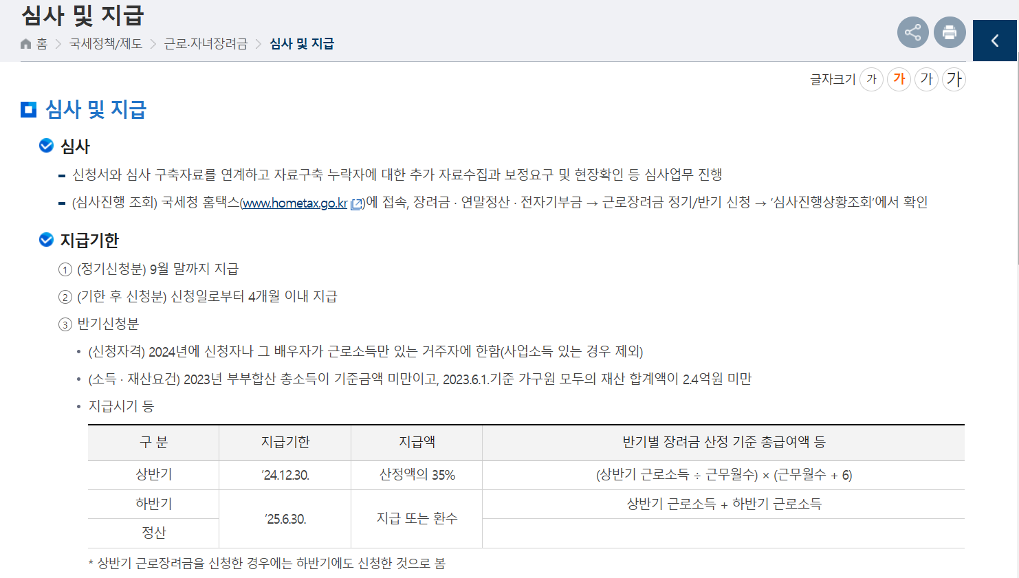 | 반기 신청 | 2024년 하반기 소득 | 2025.3.1 ~ 3.17 | 2025년 6월 말 지급 |