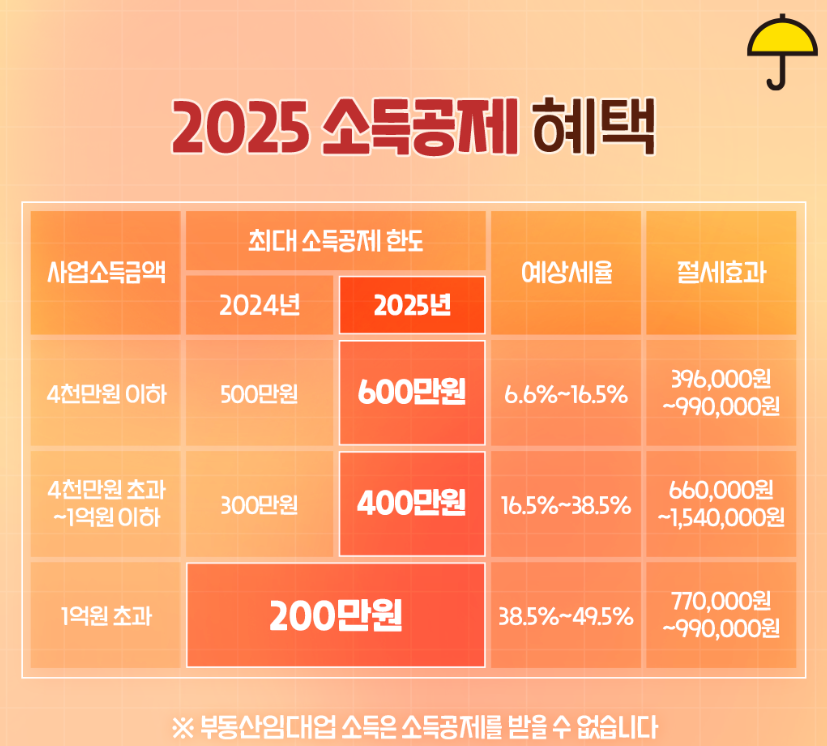 • 2024년 귀속 소득에 대한 2025년 종합소득세 신고 시에는 기존 한도(최대 500만 원)가 적용됩니다.