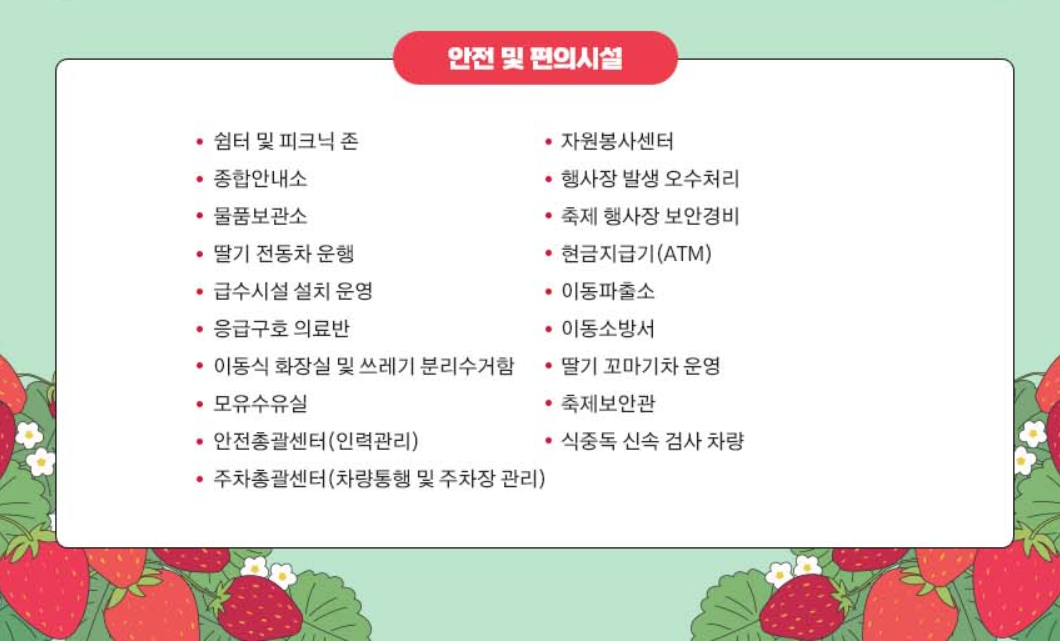 - 딸기 따기 체험: 축제 기간 중 가까운 딸기 농장과 연계해 직접 딸기를 따보고 시식하는 체험입니다. 농장에 따라 별도의 입장료나 체험비가 있을 수 있으며, 수확한 딸기는 일정 중량만큼 구매해 갈 수도 있습니다.