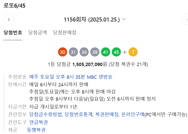 2025년 1월 25일에 진행된 제1156회 로또복권 추첨 결과, 1등 당첨번호는 '30, 31, 34, 39, 41, 45'로 결정되었으며, 2등 보너스 번호는 '7'입니다.
