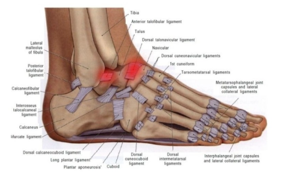 - 전비인대(ATFL): 비골의 앞쪽 끝에서 시작해 거골 앞쪽으로 연결됩니다. 내번 손상 시 가장 먼저 손상되는 인대입니다.