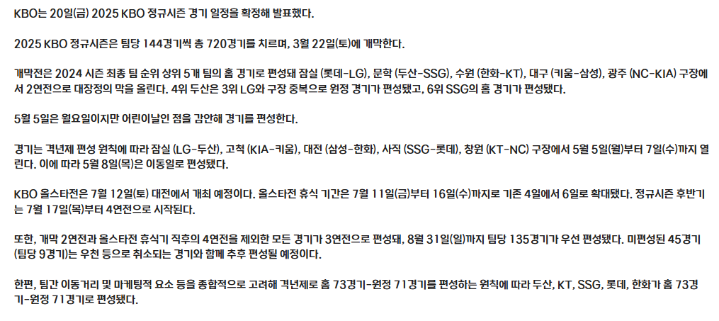 2025년 프로야구 시즌이 다가오면서 팬들과 선수들 모두가 새 시즌의 시작을 손꼽아 기다리고 있습니다. 올해는 각 구단의 전력 변화와 새로운 선수들의 등장으로 개막부터 큰 관심을 모으고 있으며, 리그의 새로운 규칙 변화 또한 주목할 만한 포인트입니다. 이번 포스팅에서는 2025년 프로야구 개막 일정과 주요 특징들에 대해 자세히 알아보겠습니다.