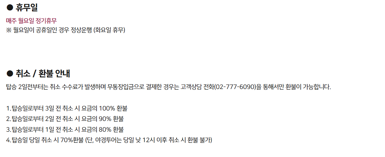 - 우천 시: 폭우가 오거나 날씨가 극단적으로 나쁠 경우 야외 좌석을 닫거나 운행 일정이 조정될 수 있습니다. 미리 운행 공지를 확인해야 갑작스러운 스케줄 변경을 피할 수 있습니다.