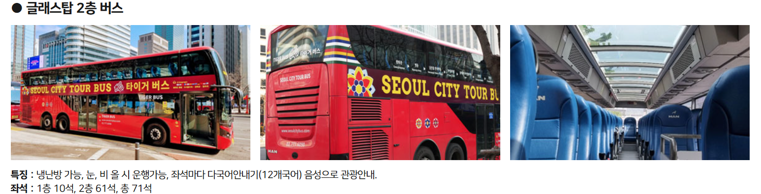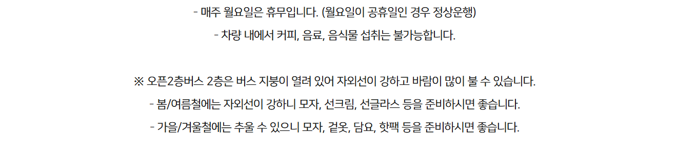 - 여름철: 2층 오픈 버스의 경우 직사광선과 열기가 강하기 때문에 모자나 양산, 선크림을 챙기는 것이 좋습니다.