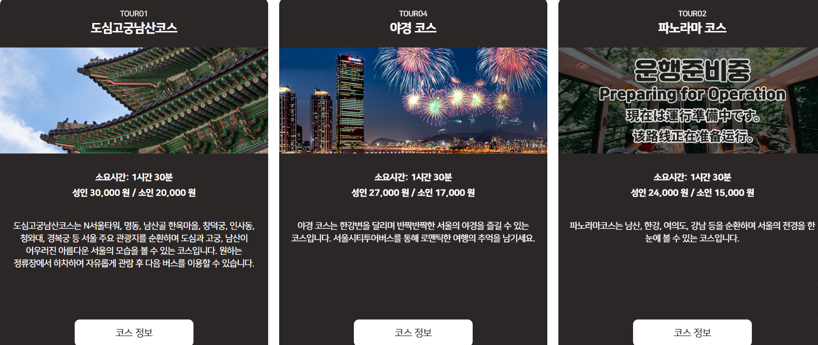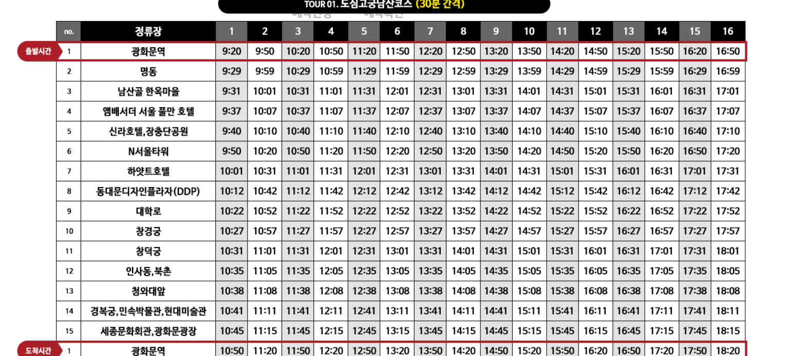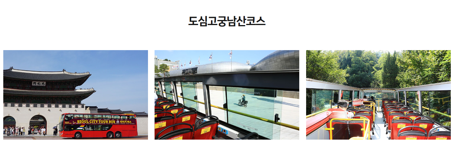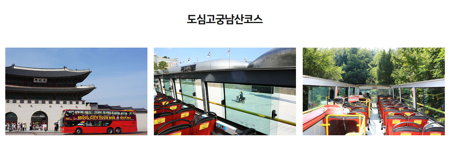 - 도심 고궁 코스: 경복궁, 창덕궁, 덕수궁 등 도심의 주요 궁궐과 광화문 광장, 인사동, 명동 등 대표 관광지를 순회합니다.