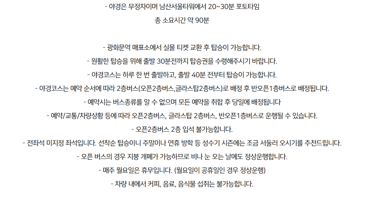 만약 야경 코스를 선택했다면, 낮 동안엔 다른 루트로 여행을 마친 뒤 저녁 시간에만 따로 버스에 탑승해 아름다운 서울의 야경을 둘러보는 식으로 일정을 분할할 수도 있습니다.