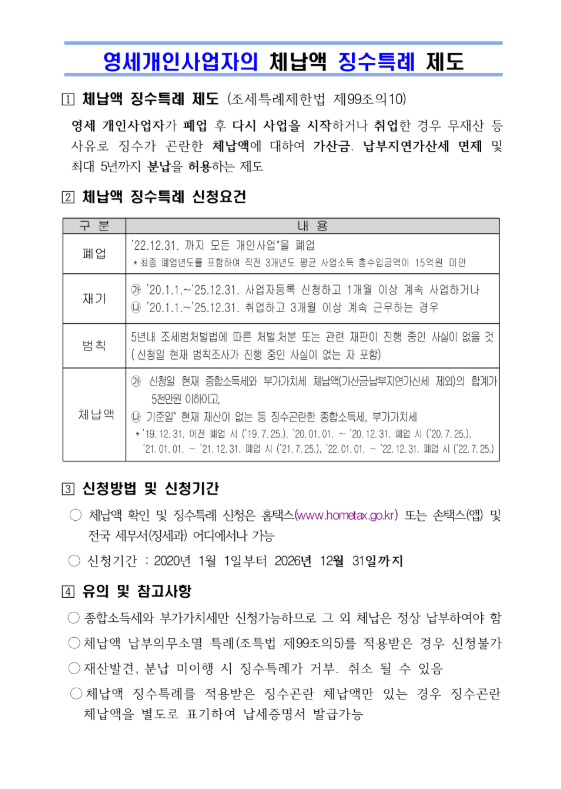 - 경제적 회복 지원: 세금 체납으로 인해 사업 운영이 어려워진 영세사업자가 경제적 회복의 기회를 가질 수 있도록 돕습니다.