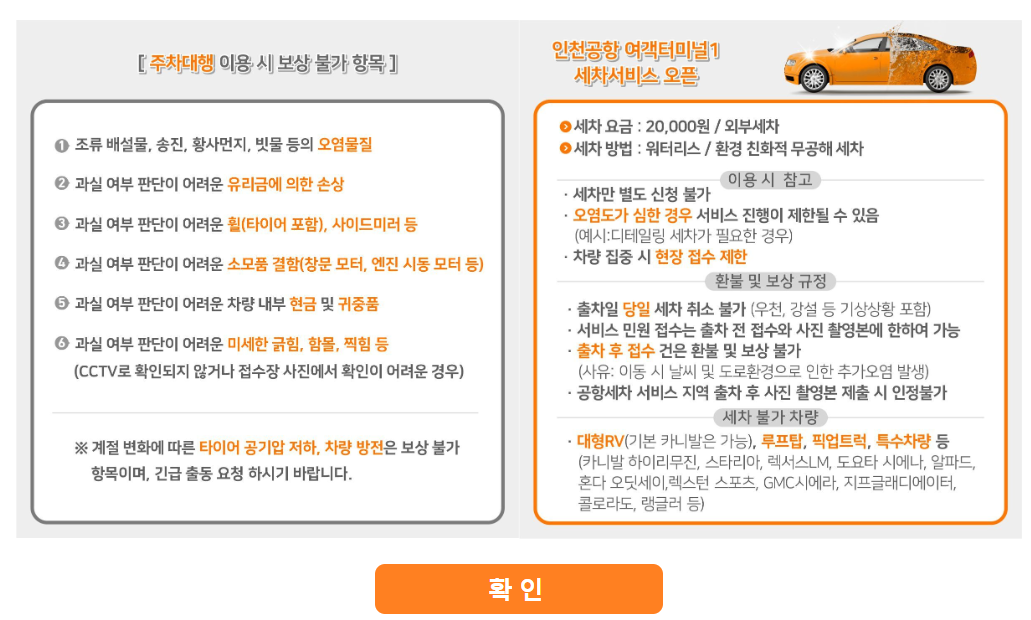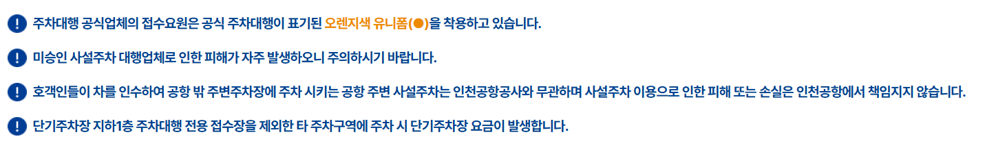 - 공식 주차대행 업체 확인: 인천공항에서 인증한 업체를 이용해야 불법 주차, 차량 도난 등의 피해를 예방할 수 있습니다.