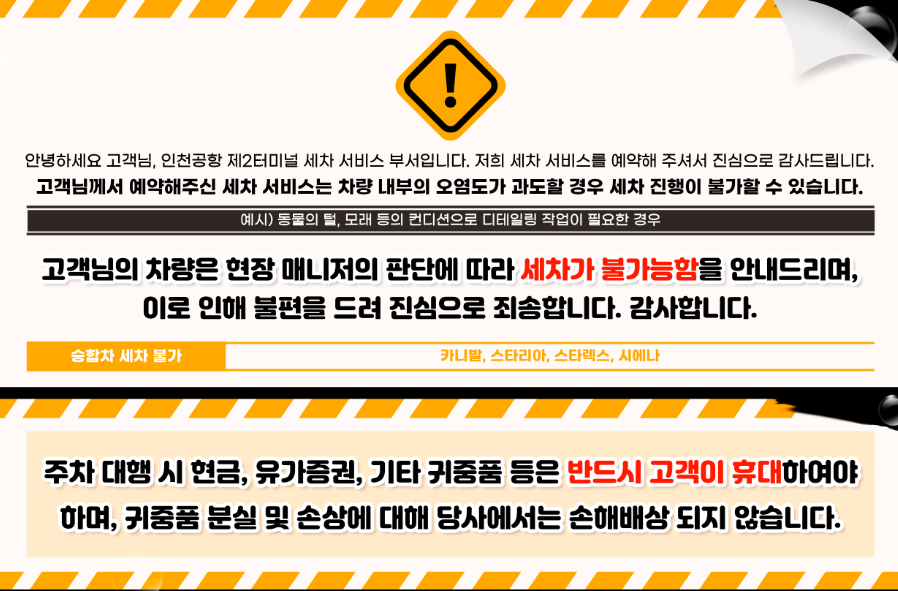 - 귀중품이나 개인 소지품은 차량에서 미리 꺼내는 것이 좋습니다.