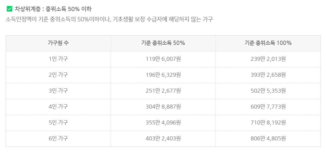 차상위계층 기준 (중위소득 50% 이하)