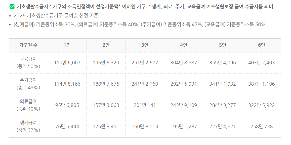 기초생활수급자는 생계, 의료, 주거, 교육 급여 등을 통해 지원받는 가구를 말하는데, 가구별 소득인정액이 기준중위소득의 일정 비율 이하인지에 따라 구분됩니다. 차상위계층은 중위소득 50% 이하이지만 기초생활수급 기준에는 해당되지 않는 가구입니다. 아래 표는 2025년 기준의 기초생활수급자 선정 범위와 차상위계층 판정 기준을 요약한 자료이니 참고하시기 바랍니다.