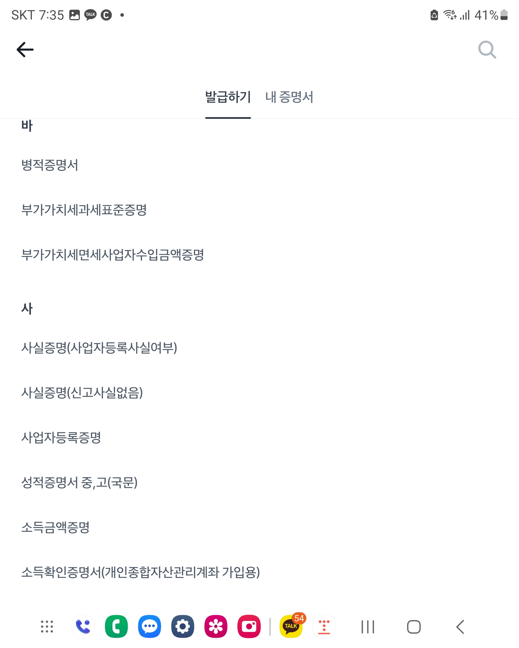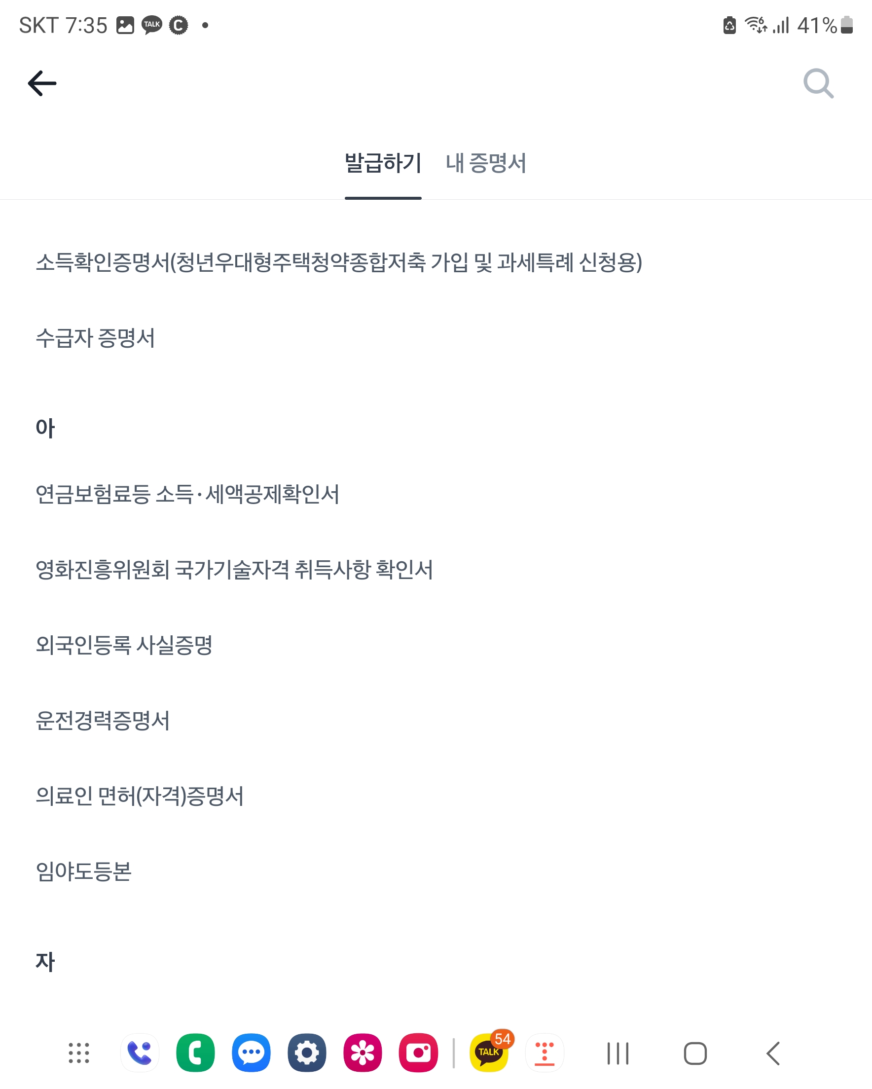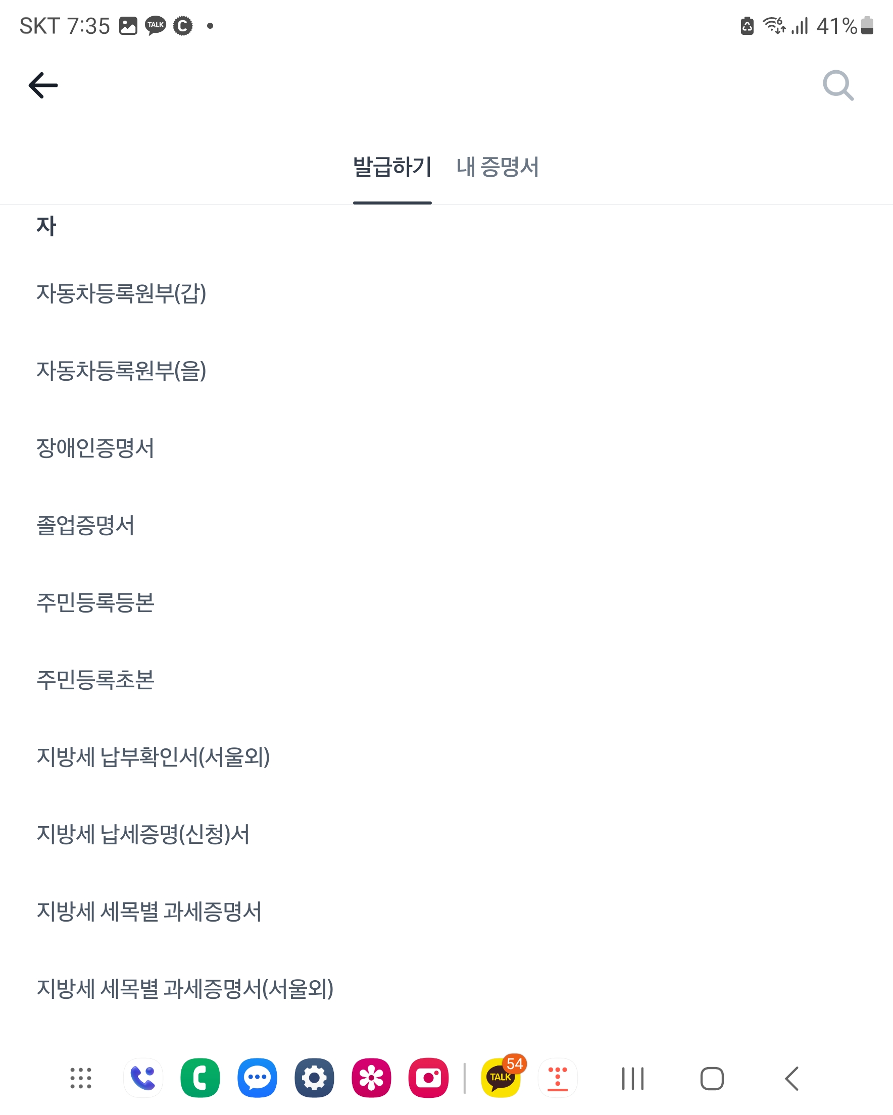 증명서 클릭 하시면 가나다..순으로 각 종 민원 서류들을 발급 받으실 수 있습니다.