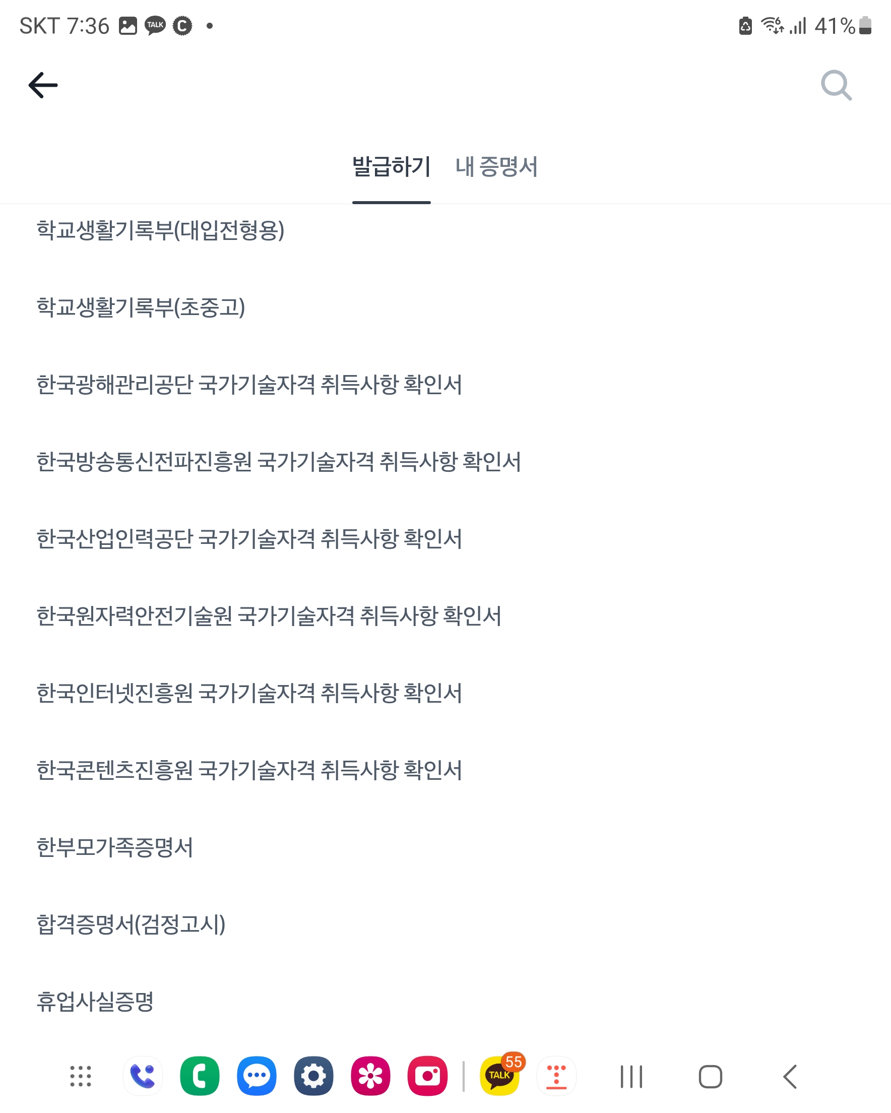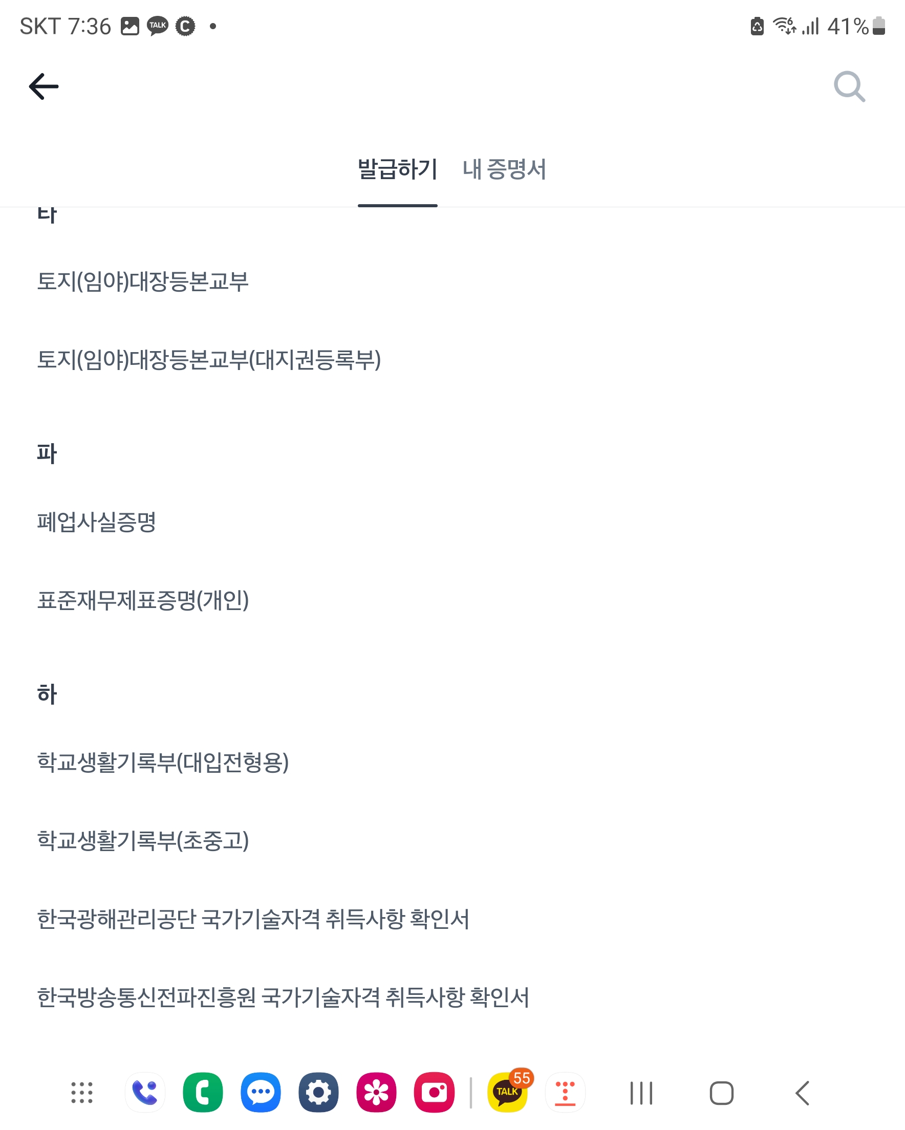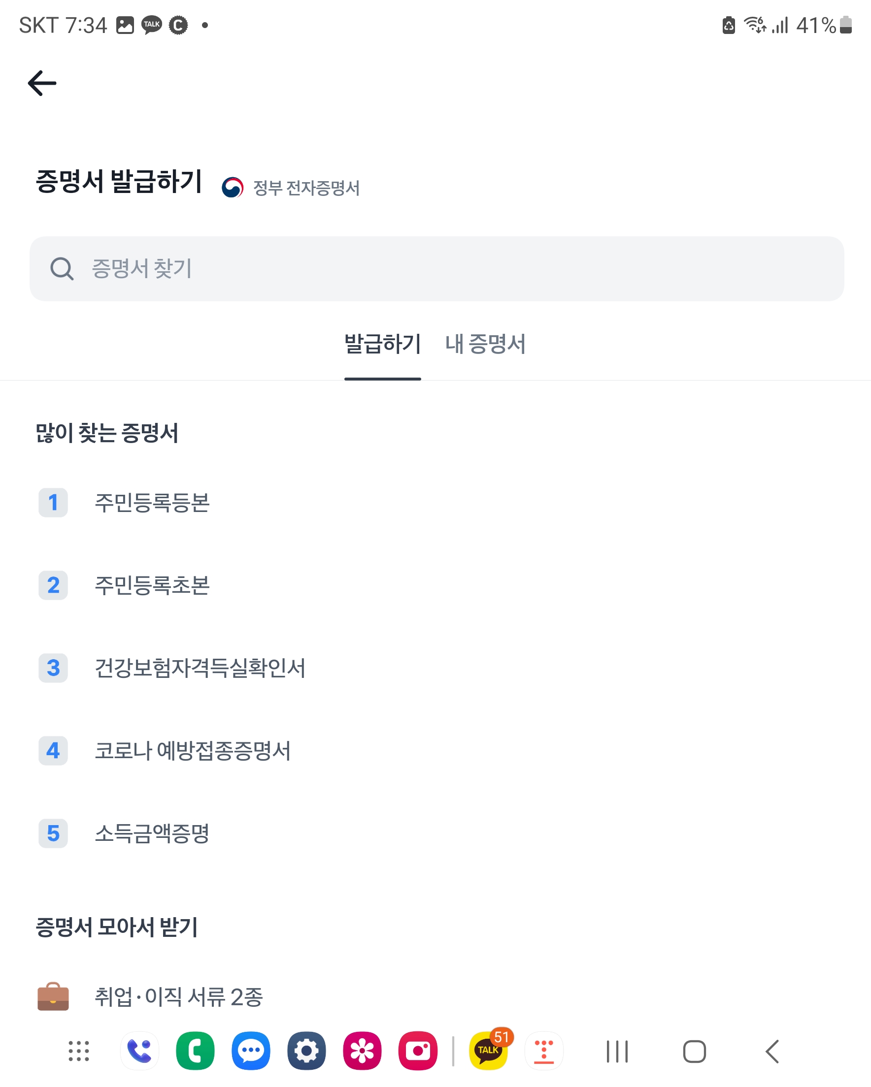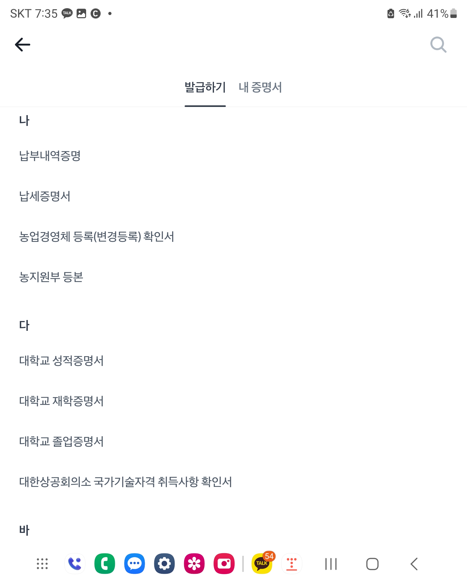 증명서 클릭 하시면 가나다..순으로 각 종 민원 서류들을 발급 받으실 수 있습니다.