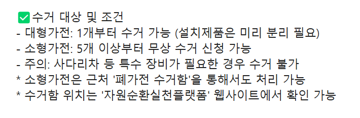 냉장고, 세탁기, TV, 에어컨 등 대형 가전은 1개 이상부터 수거가 가능합니다. ✅ 에어컨, 벽걸이 TV 등 설치된 제품은 미리 분리해야 합니다. ✅ 사다리차가 필요한 경우 수거가 불가능할 수 있습니다.