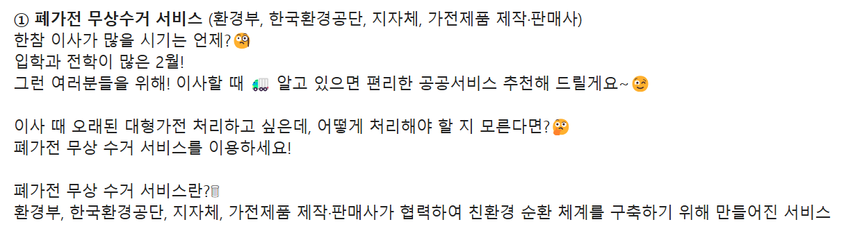 폐가전 무상수거 서비스는 쉽고 편리하게 불필요한 가전을 처리할 수 있는 유용한 공공서비스입니다. 이사를 앞두고 있거나 오래된 가전제품을 정리하고 싶다면 e-순환거버넌스 웹사이트, 전화, 아파트 관리 앱을 활용해 간편하게 신청하세요.