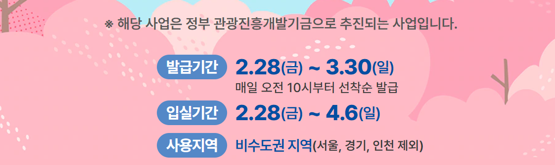 - 숙박할인권은 온라인 플랫폼을 통해 선착순 배포됩니다.