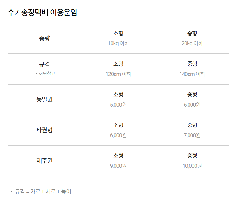 • 최대 5kg 이하 소형 박스에 적합하며, 세 변 합이 100cm 이하가 대부분 기준입니다.